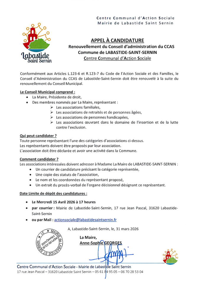 Le Conseil d’Administration du Centre Communal d’Action Sociale (CCAS) va être renouvelé à la suite du renouvellement du Conseil Municipal.
