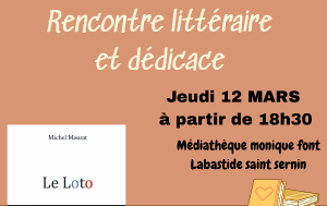 Michel Maurat viendra dédicacer son livre "le loto" lors de la rencontre littéraire du 12 mars. Venez pour échanger avec lui, il nous présentera la maquette de son prochain livre.